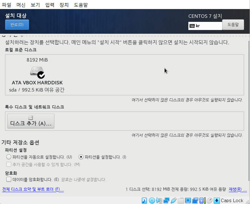 기타 저장소 옵션에서 파티션을 설정합니다 클릭 후 완료버튼 클릭